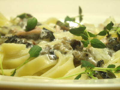 Keitä tagliatellet napakoiksi. Paahda pinjansiemeniä hetki kuivalla pannulla, mutta varo polttamasta sillä se tapahtuu helposti. Pilko sipulit ja kuullota niitä hetki pannulla öljyssä. Pilko sienet, huuhtele hyvin, paistele sipulien joukossa. Älä käytä sienten lientä. Lisää myös pilkottu kinkku. Tee samalla pienessä kattilassa valkkarikastike. Mittaa kattilaan valkoviini, laakerinlehti ja kanaliemijauhe. Kiehauta ja lisää kerma ja fariinisokeri. Silppua sekaan tuoretta timjamia ja lisää tuolaa tarvittaessa. Poista laakerinlehti. Sekoita kastike pannulle korvasienten joukkoon. Lisää myös pinjansiemenet.